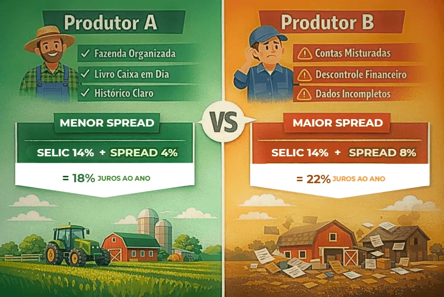 Se a propriedade é organizada, com números claros, histórico confiável e controle financeiro, o banco enxerga baixo risco e reduz o spread.