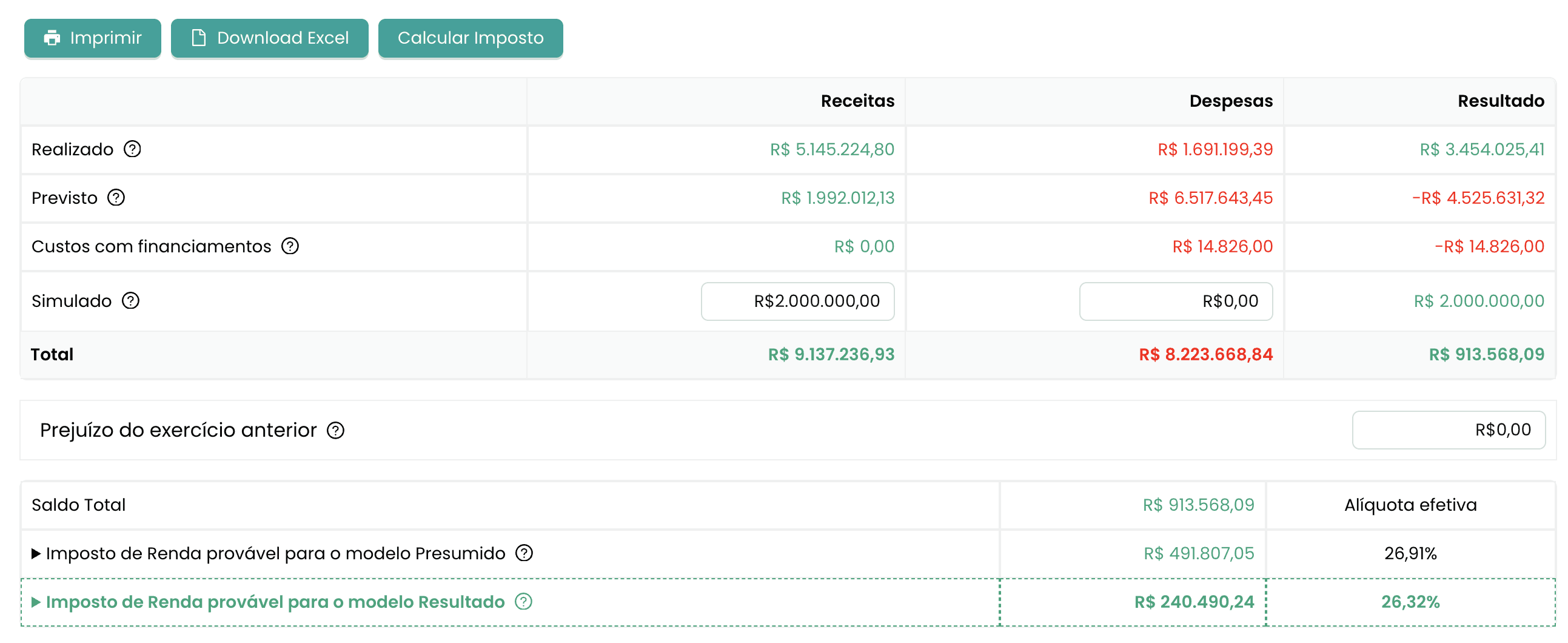 Você lança o valor estimado e o sistema recalcula na hora o impacto fiscal, antes mesmo de você fechar negócio .