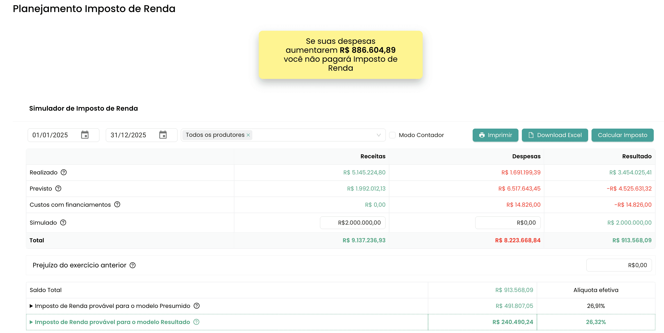 Veja como a projeção em tempo real, o simulador e o rateio automático reduzem o imposto legalmente