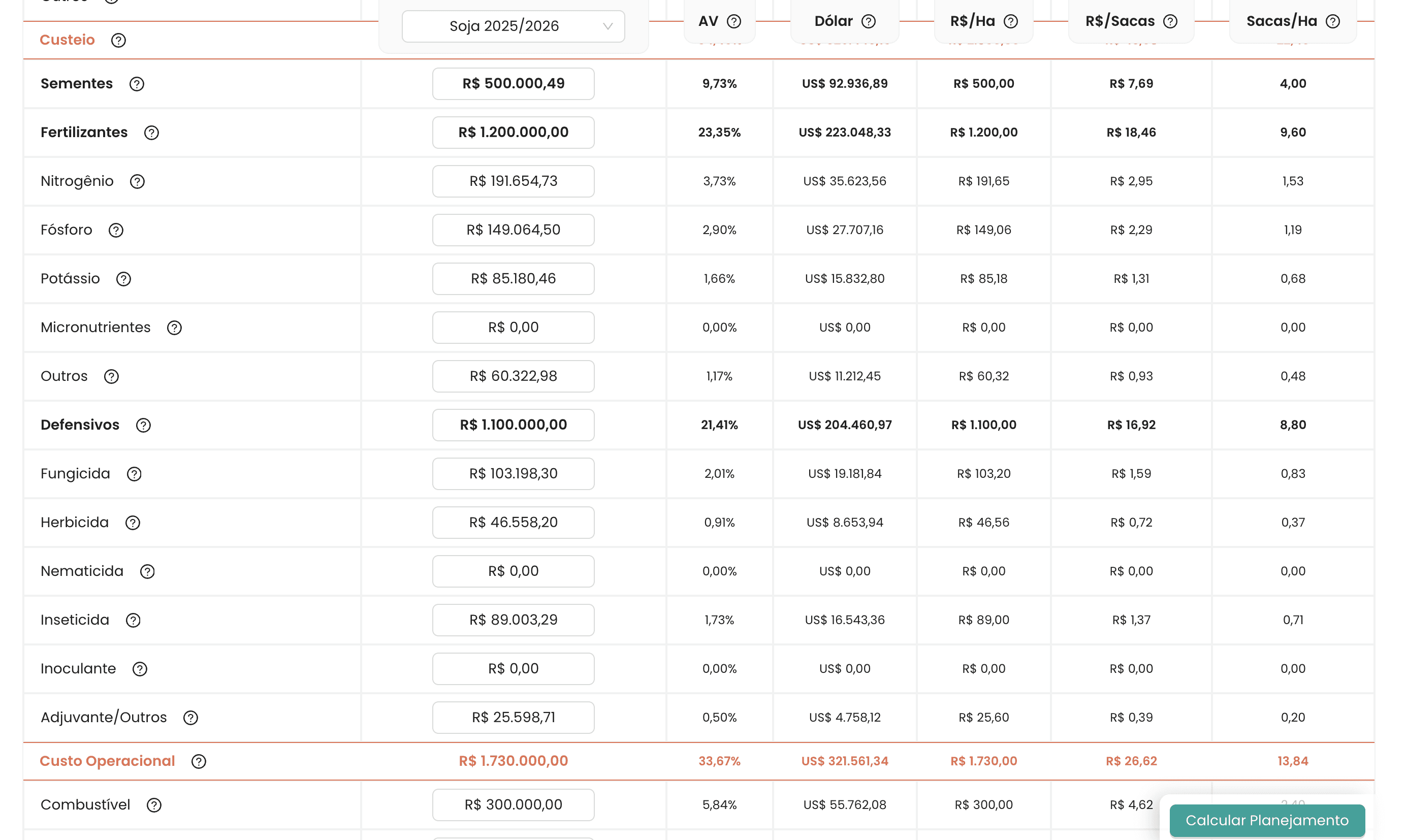 Além de planejar, a ferramenta permite comparar. O sistema oferece referências de mercado baseadas em notas fiscais processadas, permitindo saber se o custo orçado para fertilizantes ou defensivos está dentro, acima ou abaixo da média do mercado.