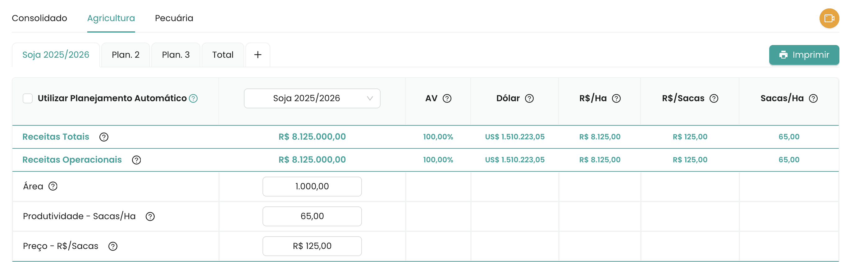 Basta inserir os dados básicos de área, expectativa de produtividade e preço para que o sistema projete automaticamente a receita.