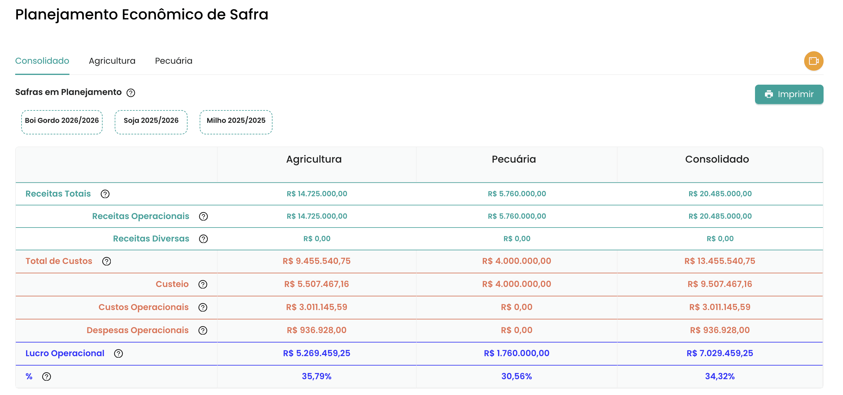 O sistema gera um consolidado total, mostrando se o lucro de uma atividade cobre eventuais déficits de outra ou se a soma das atividades paga os investimentos gerais da fazenda.